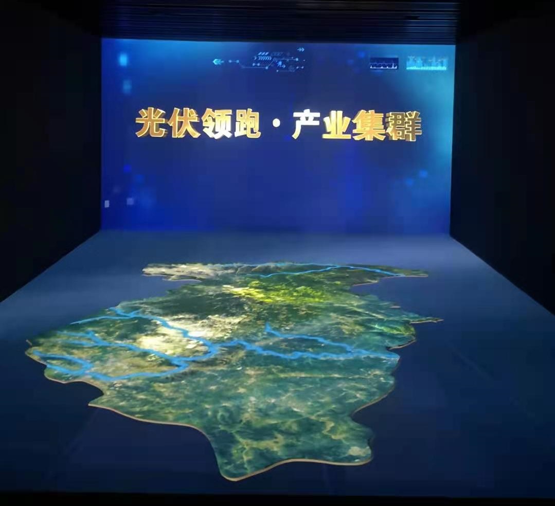 該區(qū)域為12臺投影機投射出的L型裸眼3D沙盤,展出了,鐵路和公路交通圖,礦產(chǎn)區(qū)域分布情況;以及“光伏領(lǐng)跑 綠色發(fā)展”主題影片,一同感受陽泉光伏領(lǐng)跑者示范基地一路走來的光輝歷程。